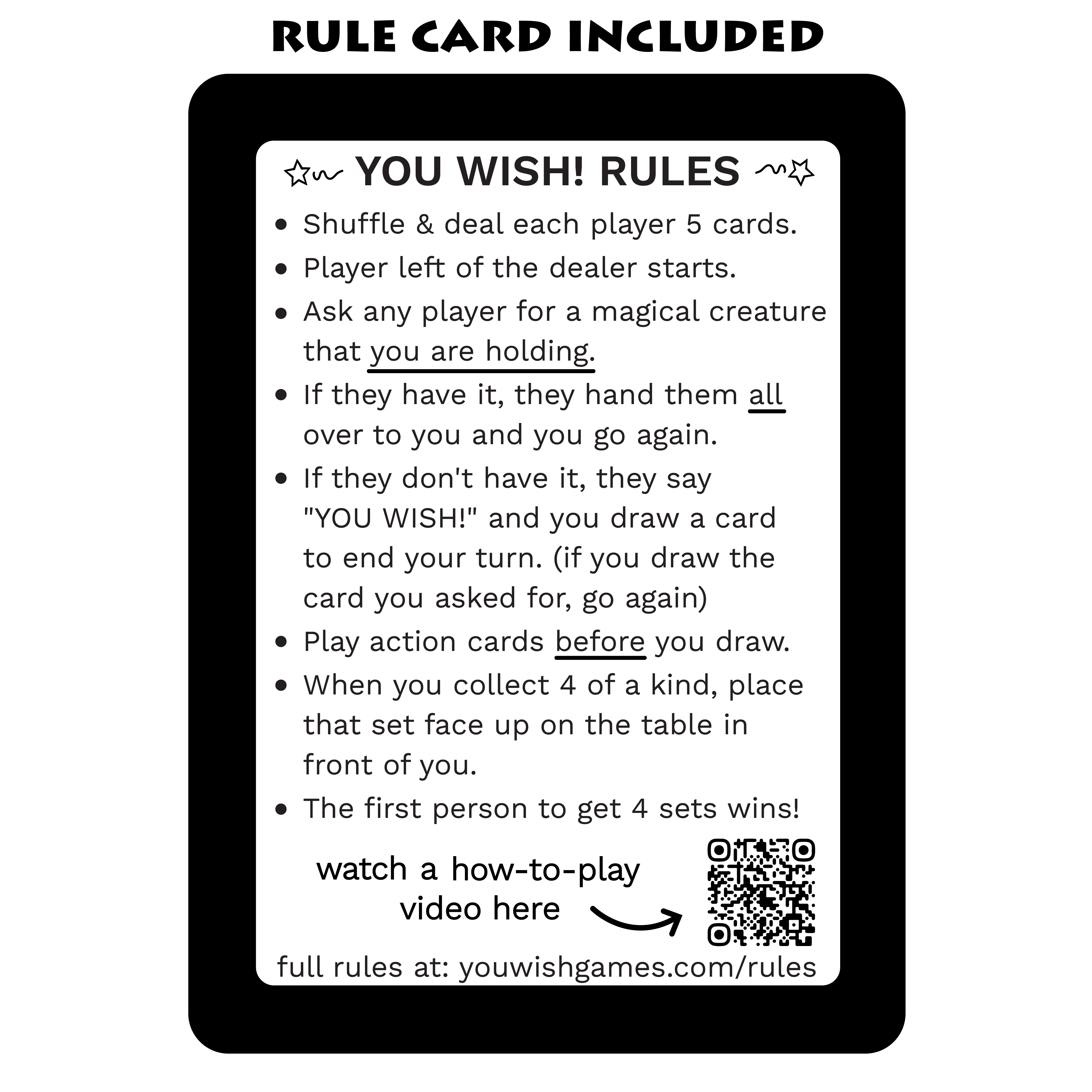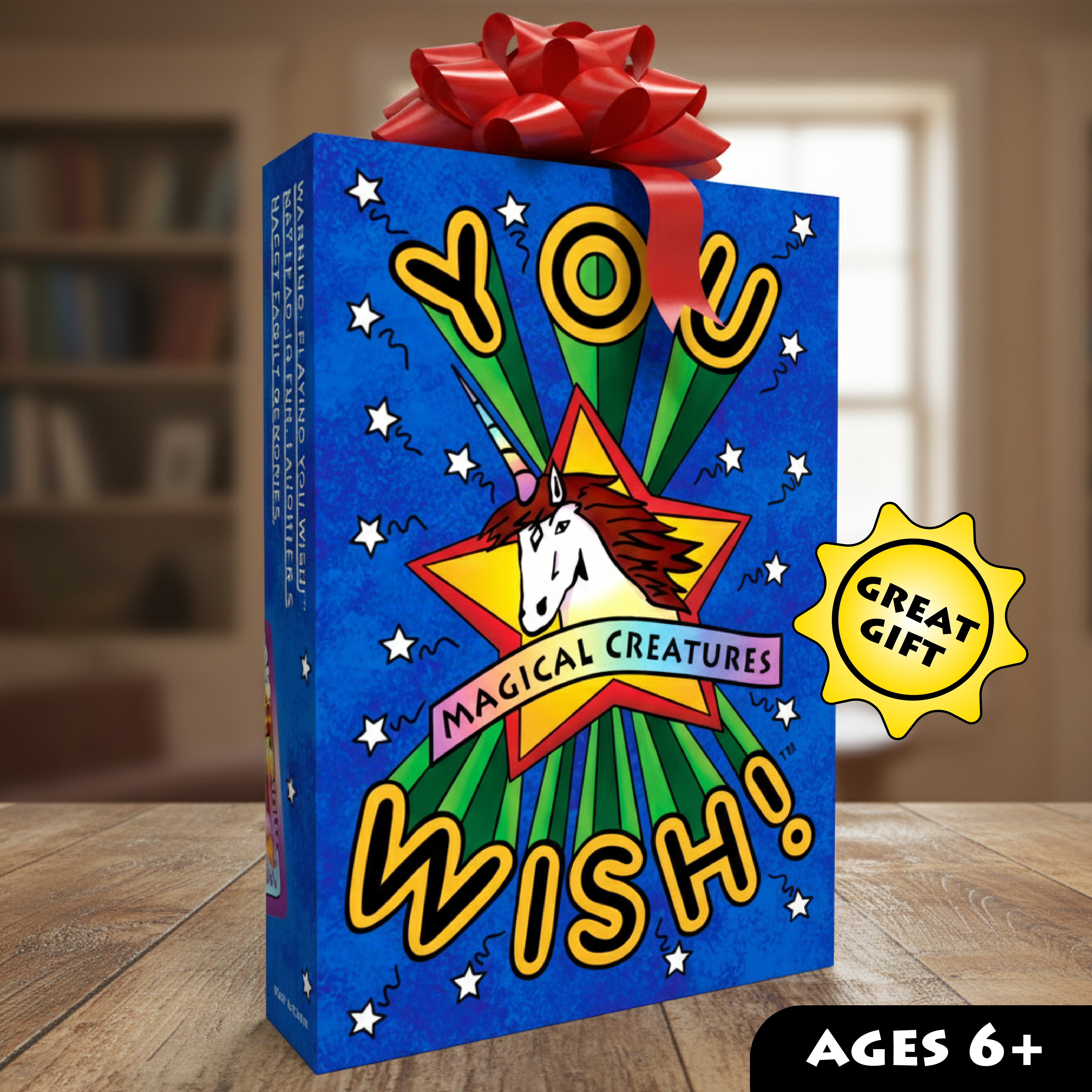 The original You Wish deck featuring unicorns, dragons, and more magical friends. Perfect for family game nights with 2-6 players, ages 6+.
